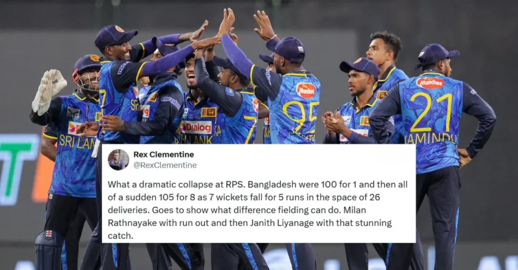 What is a dramatic collapse in RPS. Bangladesh was 100 for 1 and then suddenly 7 wickets for 8 for 8 for 7 wickets fall for 5 runs in 26 delivery space. It goes to show what the fielding can distinguish. Milan Rathnayake was run out and then Janith Linazage with that amazing catch. pic.twitter.com/d1bwhhqvst